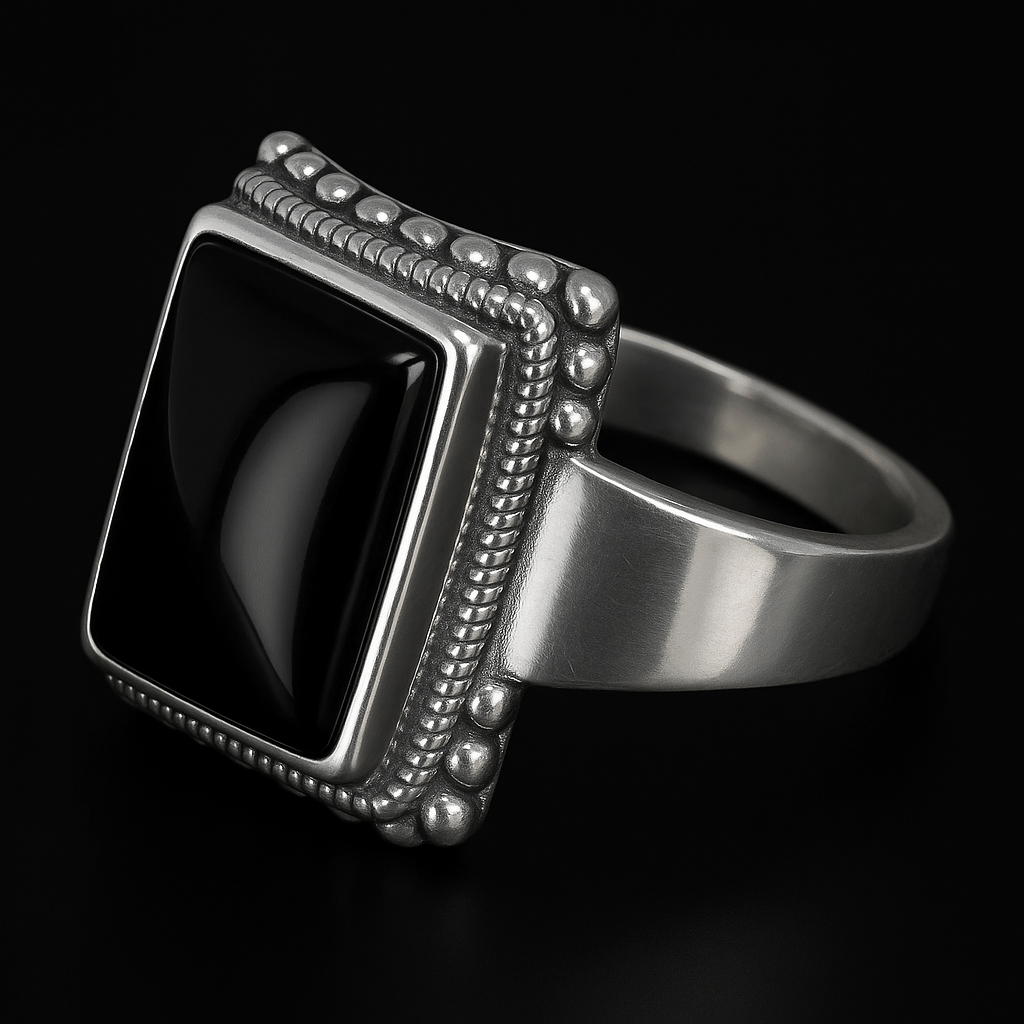 A bold square-cut black onyx set in natural sterling silver with beaded detailing around the edges. The deep, glossy stone contrasts beautifully with the polished silver, creating a timeless piece that’s both elegant and powerful. Perfect for making a statement with style and sophistication.