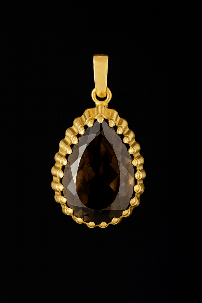 This pendant features a faceted teardrop Smoky Quartz gemstone, cherished for its grounding energy, clarity of mind, and ability to dispel negativity. The stone’s deep, earthy hue blends beautifully with the warm Panchadhatu setting, creating a piece that is both elegant and deeply meaningful.